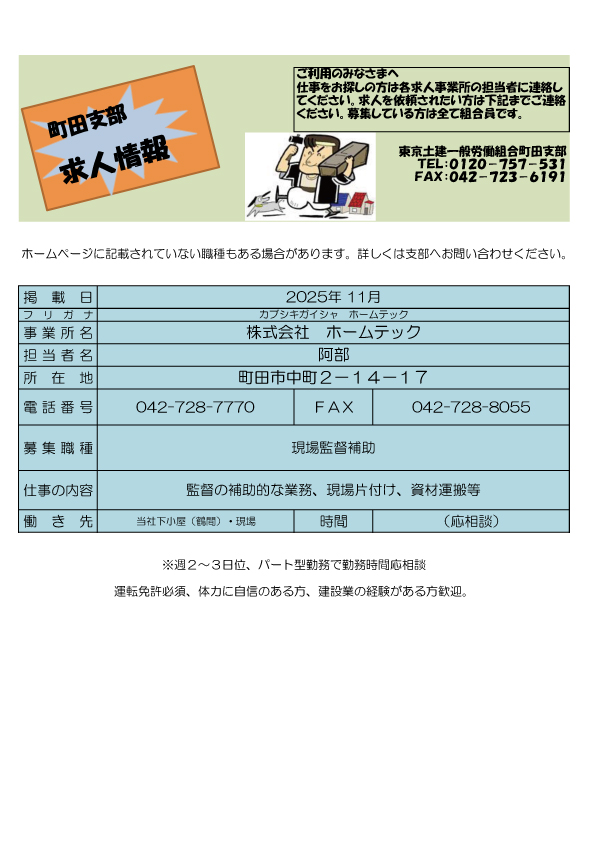 〒194-0032 東京都町田市本町田2387-5 東京土建町田支部 TEL:042-722-0141 FAX:042-723-6191